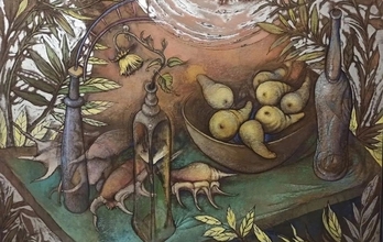 Художник работает в уникальной авторской технике, используя картон, бумагу, различные водные краски, серебро и позолоту. Мощное декоративное начало, активная линия, "плотный" цвет и сложный мир образов - вот что делает работы автора своеобразными и незабываемыми.